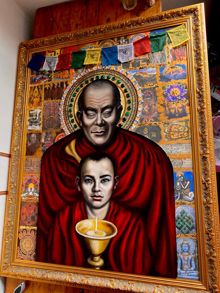 Her elaborate finished paintings often incorporate many layers and mixed media techniques including the use of crystals, gems, diamond dust, gold, silver leaf and neon.The end result is a beautiful mash up of Religious Iconography, Renaissance style painting and Pop culture.