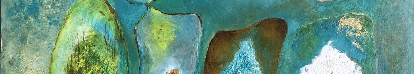 Lucy uses acrylics, ink, gold paint, and sometimes collage. She works on canvas or a mounting board. She uses the peaceful and meditative combination of blue, turquoise, and green with dashes of wine red or pink.