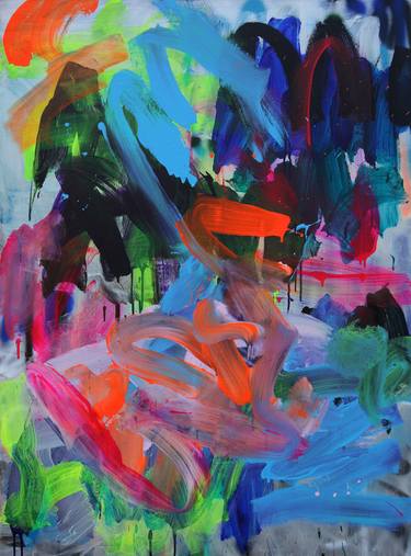 Dragomir’s process is organic, beginning the paintings with gestural brush marks, impulsive scrawling and graffiti. Layers are introduced in stages and the direction of the painting is informed and influenced by each previous mark and colour. They are suggestive in possibilities and provide some insight into the sensation experienced while creating the works.