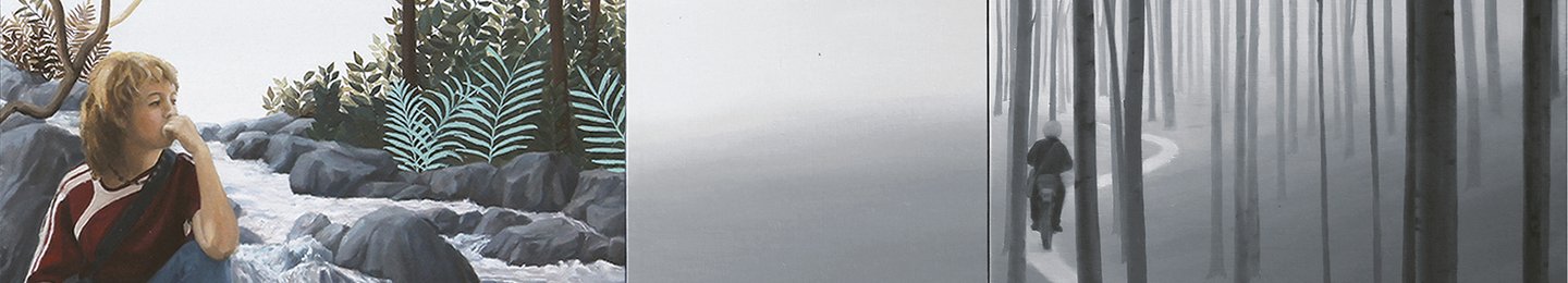 Following a perceptive thread, I often paint diptychs or triptychs, short stories in which the representational space is divided and the narration takes place between colored and monochrome canvases, pursuing the psychological connections between moments that are distant in space and not necessarily contemporaneous.