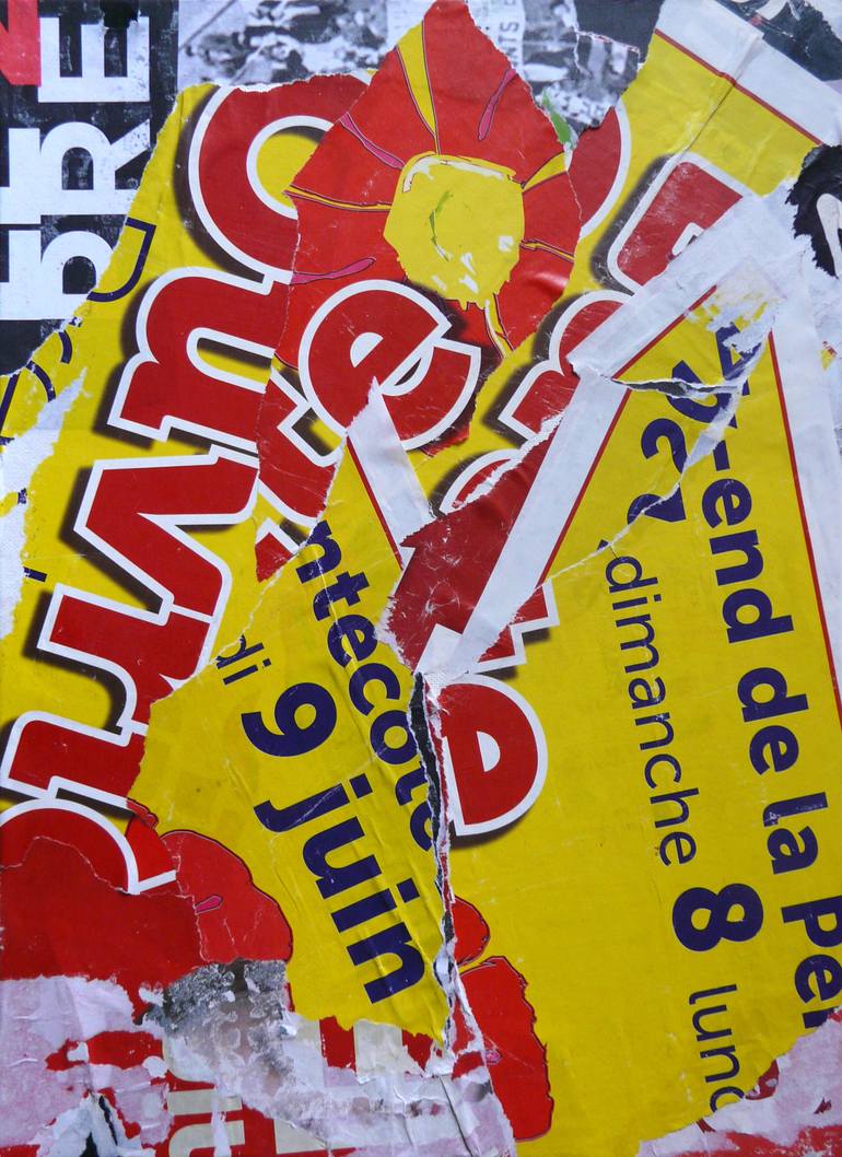 Torn posters on cardboard. Part of a series made from posters collecetd in Paris, rue du Borrégo.