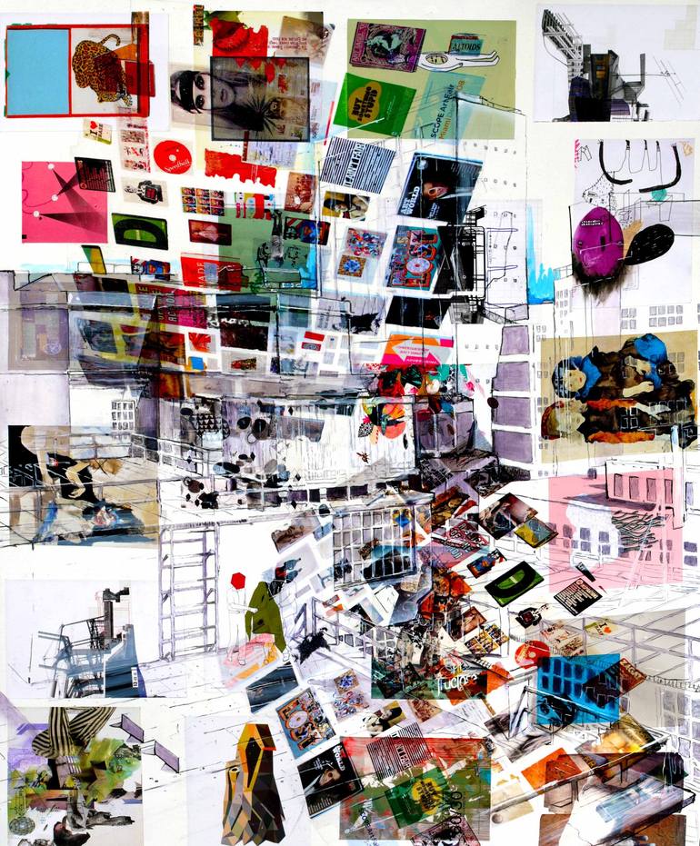 mixed media, layered paper collage transparent vinyl, oils on canvas