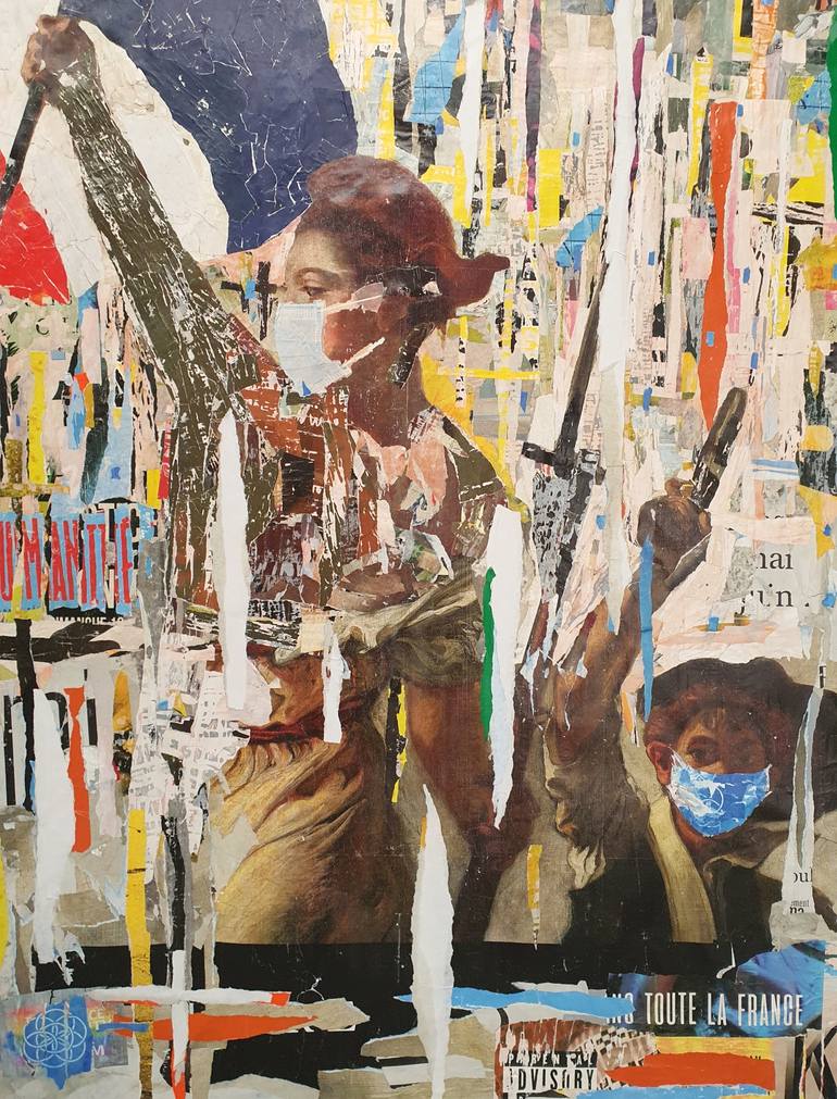 MadeReady ou Collages d'après l' appropriation et détournement du tableau d' Eugène Delacroix " La liberté guidant le Peuple" - 1830 - Travail autour de la réflexion sur comment inciter les gens à porter un masque.