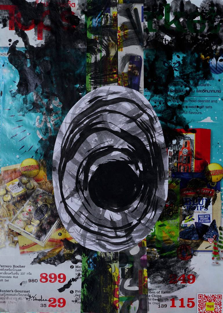 The original abstract painting,medium collage paper and acrylic on product brochure paper.