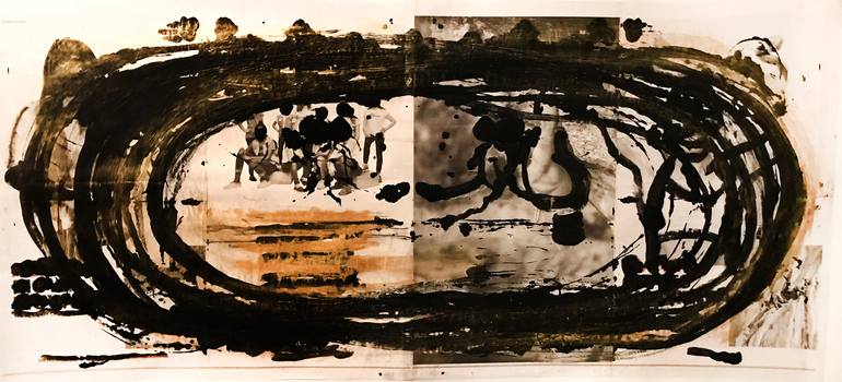 I often get inspired by images I see in the news and advertising, the type, fonts in print, news print, figures in a pose. I will collage and often over existing pages from the NY Times. This resulted in a unique work that was part of my Hole series and then used in an apparel line of scarves, shirt...