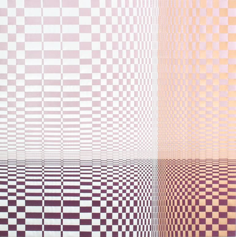 This square piece is made with satin ribbon attached to an aluminium with wooden frame. The ribbons are woven, four different colours are used (two horizontal and two vertical). When you walk pass the artwork, it changes because of the light shining on the material. Also during the day it changes. T...