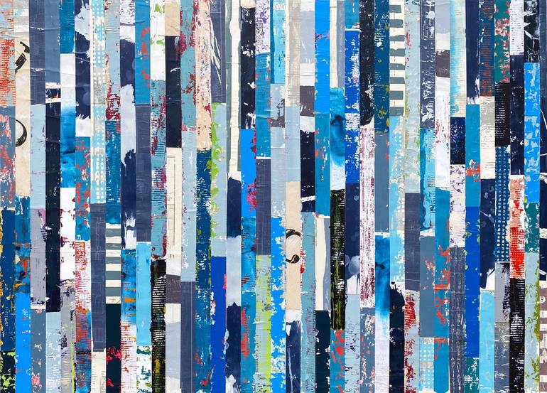 This piece is from an ongoing series of paper collage art. The base of this sea and sky-inspired piece was constructed entirely of paper collage from cyanotypes, vintage sailing maps, charts, watercolor paper, envelops, and paper ephemera. I then layered acrylic paint over the bars to create more in...