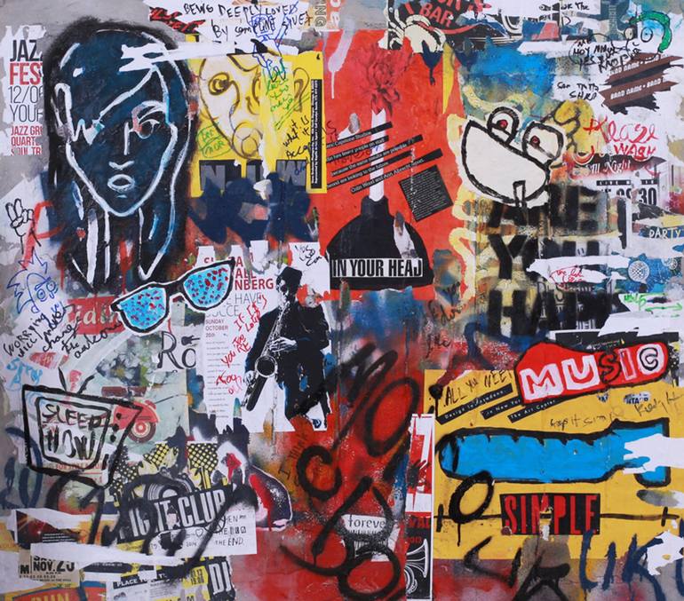 "Are you happy?", acrylic, spray paint, collage on real concrete and wood Hauser uses everyday materials from the urban environment and upgrades them into art. The art draws authenticity from being presented on a “canvas” of rough industrial concrete. Hauser uses spray paint, paintbrushes, and moti...