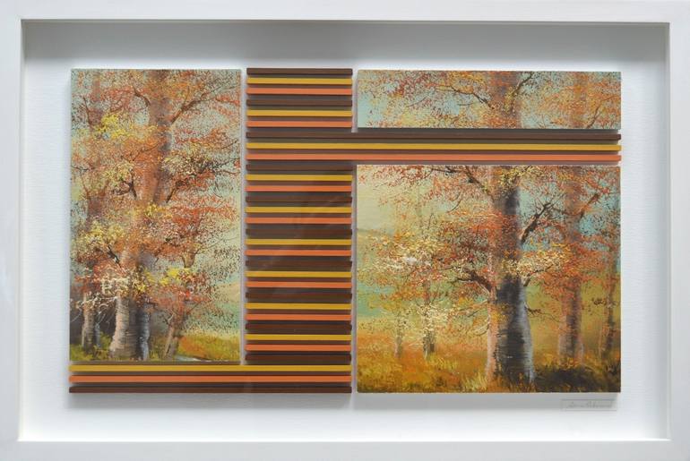 A found vintage oil painting and acrylic painted wood on canvas with a three-dimensional element. The work is presented behind glass within a white, wooden frame. This mid-century find was painted by an unknown artist. It has been divided into sections and then raised on wooden panels. Laser-cut MD...