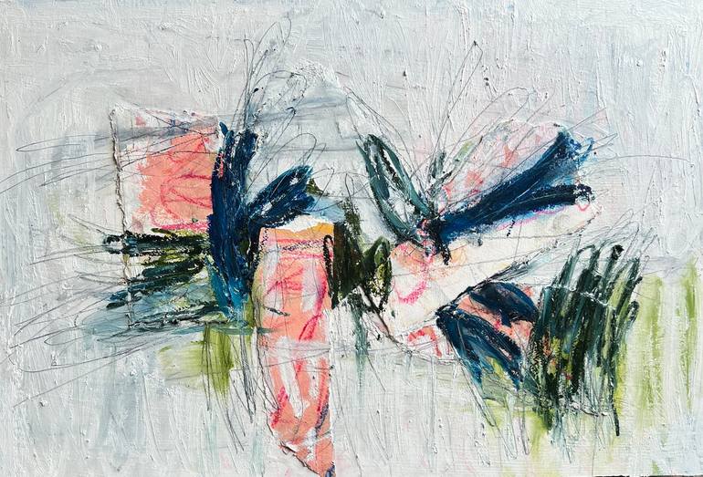 This looks like a whimsical version of fishing bait to me and it feels like a bouncy tease. Pencil, acrylic and torn painted paper on a 24 X 16 piece of plywood.