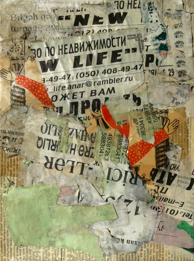 Paper adverts from Bakou street walls, old books pages, on canvas over board