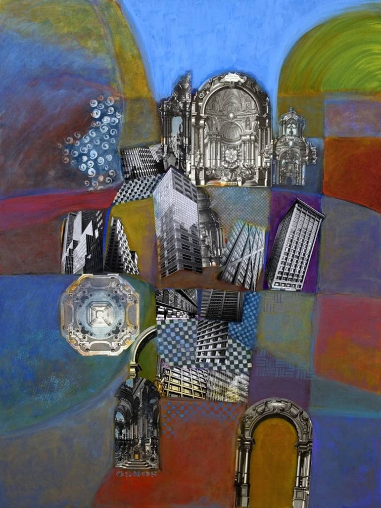 I was an art director and book designer with Random House. Since leaving publishing, I have focused on painting and collages. My design work used photographs, maps and manipulation of type, which still inform my collages. I use acrylic paints to build a textured surface with layers of color. I love finding graphic elements that enrich the canvas--sometimes themes emerge and evolve that differ from my early expectations. My “pure” paintings (without collage) are often abstract, fantasy landscapes inspired by photos of aerial views. My work has been exhibited in galleries in New York. It is in private collections in the New York, Connecticut, New Jersey, Vermont, California and Singapore. For more of my work, go to