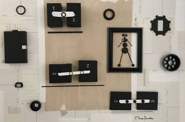 The artwork "Black Out" was inspired by a collection of boxes from my hearing aid purchase and some old camera accessories. I mounted these 3D objects on a background of file cards and stressed paper for texture. A point of interest is the quirky figure in the frame. The viewers will be intrigued a...