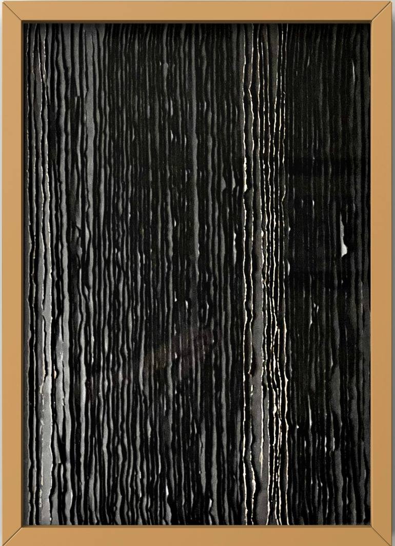 Discover the epitome of craftsmanship in this stunning handmade art piece, framed in rich wood and measuring 70 x50 centimeters. The artwork features meticulously placed black paper strips, brought to life with radiant golden highlights. To ensure its timeless beauty endures, it's encased behind a 2...