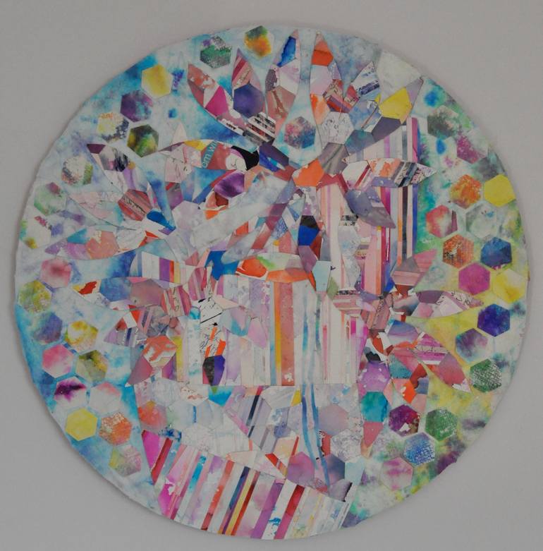 A secret bouquet, in striped 'vase', hidden at first, underneath it's patterned sacred geometric ordered chaos. This piece explores the continuation of the sacred garden series, to learn to see the quiet order that is life in the web of creation. Piece is 16" diameter, made of recycled water color...