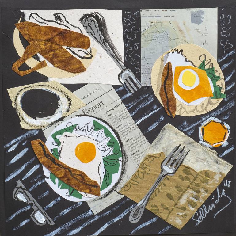 "Brunch" is a still life collage, inspired by photos in social media those days. The painting is small and part of another 3 mini collages. It is come in with white box frame with glass. Print is optional too.