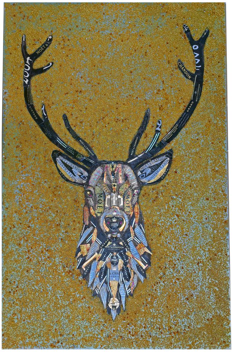 A very textured 3D collage of a golden buck, using materials such as champagne foil labels and beads.