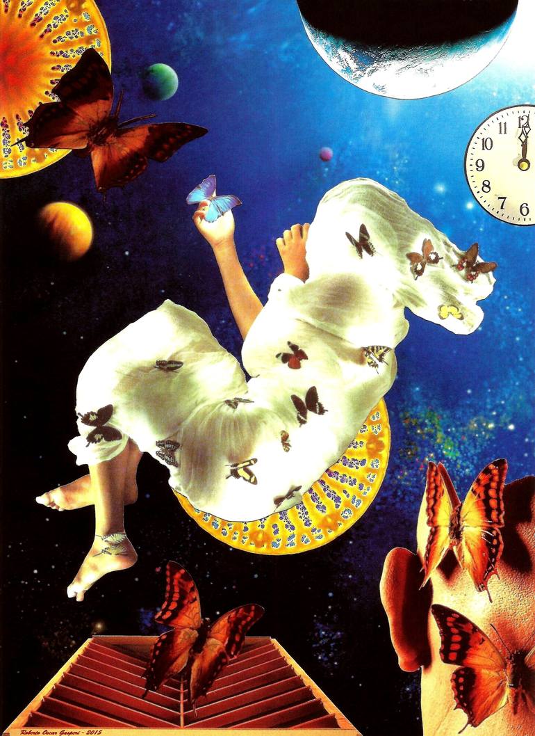 Collage handmade with paper, glue and scissors. Made in Caba, Argentina. Roberto's collages take you into a surreal world. However, his surrealism is based on real world characters in a surreal or incongruous setting, such as football players in the desert with a saintly figure looking down on them...