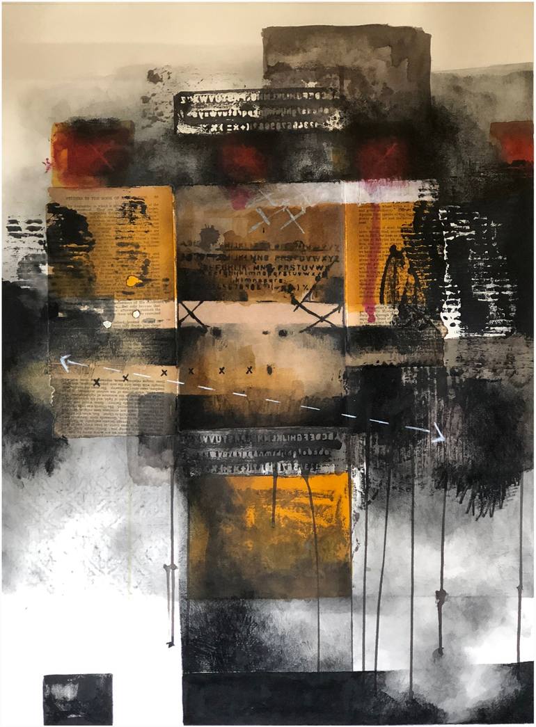 Layered grey lead pencils [various types], inks, acrylic paint colour, oil sticks and printing techniques. Collage with vintage book pages and transfer techniques. Drawing on quality Saunders Waterford300 gsm paper. [not framed] Artwork will require framing for proper hanging and finish. Signed a...