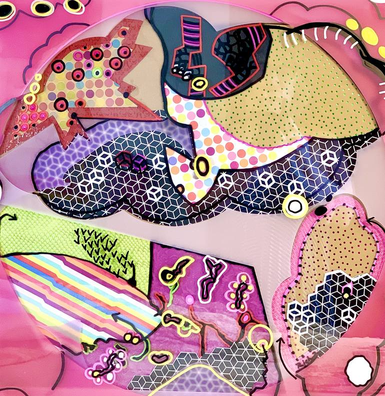 NOTE: MIXED MEDIA FIBERART. This intriguing piece is even brighter in person, and will make anyone seeing it, happy! Made of laser cut layers of plexiglass with layered. collaged papers and painted areas. With its abstraction, and such a graphic intensity, it is really a showstopper! Step right up, ...