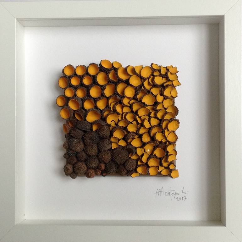 Nature provides us with complex and beautiful forms and I like to take some of those and give them a human touch by disposing pieces to make different compositions. In this piece I used cupules of kernel oak acorns, painted them and placed them to achive a rhythm to meet my aesthetic expression.