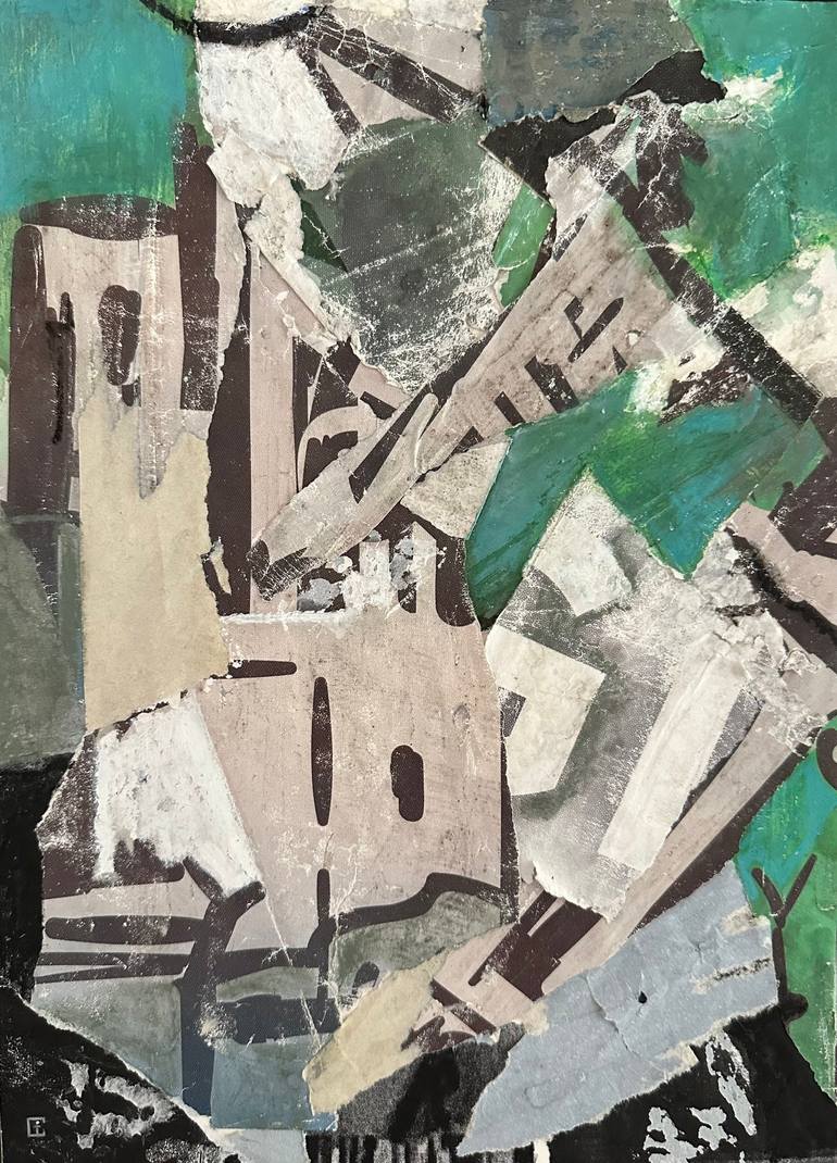 I used different layers of paper cuttings from advertisement and publicity street posters from Rome, Italy. My idea was to create a composition of a city, inspired by the decadence and texture of recycled material.
