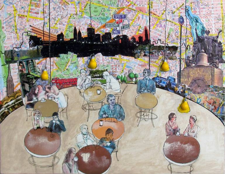 A coffee shop is a place of refuge, where ideas are born, problems are solved, friendships are formed, books are read, stories are written and work gets done. It's a place to be by yourself, but not alone. The world outside the giant glass window continues on irregardless. This collage on wood was c...