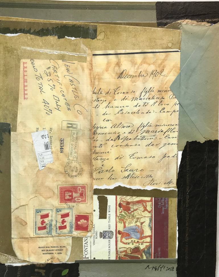 Part of an on-going series of collages in various styles begun in late 2017. This particular assemblage of pasted papers consists of handwritten vintage document, old scribbled found envelope, a wine bottle label and some found torn papers. The aim was to evoke a vague mood of nostalgia and a sen...