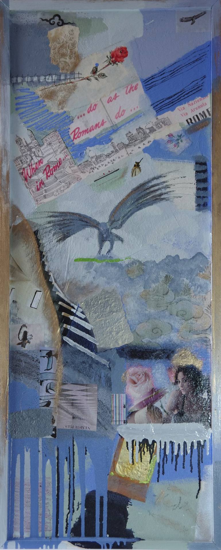 This series involves a humorous & light hearted look at how much we assimilate into or adopt the culture of one’s adopted country. Mixed Media ~ vintage maps and wallpaper, decoupage, fake gold and silver leaf, house paint, charcoal, pencil, variety of handmade and hand printed papers and gold wax.