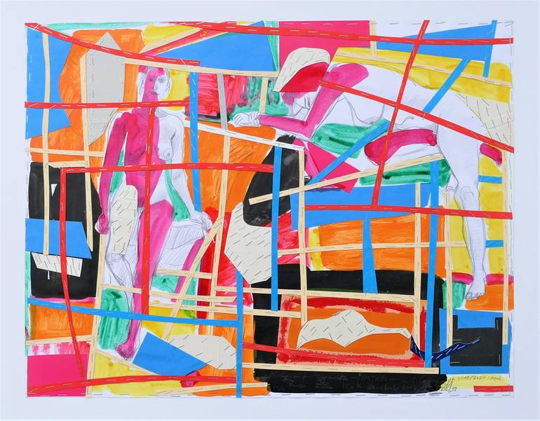 This original collage features an abstract composition where lines dance across two female nudes. Rendered in light colors, the horizontal and vertical lines both define and obscure the figures, perhaps caught in a moment of gymnastic exercise. The artist explores the interplay between abstraction a...
