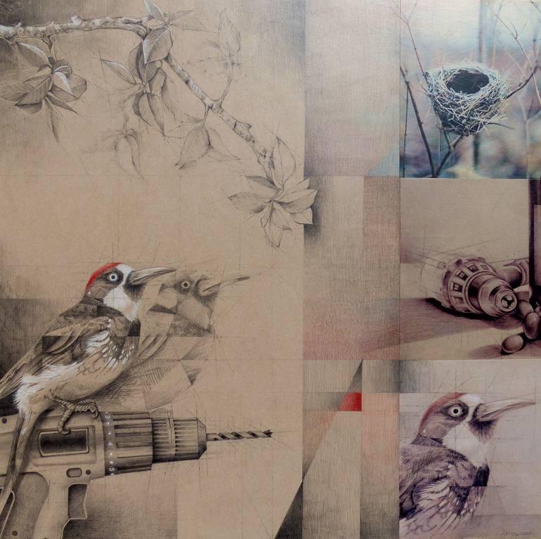 Many of the most clever tools we have invented for our use today, were already created long ago by nature. Works in this series join the past with the present, nature resides with technology, and graphite does a graceful dance with collage. Balancing opposites and disparate objects to create a sens...