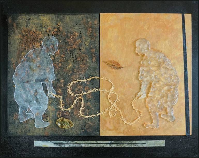 I am a mixed media artist with a preference for making 3-D work. Themes recur in my art: I use found objects, and may use molds& casting of my small pieces to create new work. I enjoy photography, "straight" and digitally manipulated, and sometimes include my photos in my collage artworks. Maybe my motto could be "art by any means necessary". My work is somewhat unusual, and perhaps I walk & work on the Dark Side. However I see hope and beauty everywhere, and hope that is part of even my darkest artworks. * * * Read a 2021 article about my work at Obsessed with Art here: . Personally I am obsessed with making: after a 20 years working with computers, I turned to art full time. I left the city of Seattle for a cohousing community in idyllic small town Port Townsend. I have a particular love of sculpture, assembly, & collage: I draw, paint, sculpt, assemble, blog (). I use a wide variety of media: pencil, colored pencil, pastels, watercolor, ink, resin, cement, wood, stone, fabric and more. My original work is often transformed & reused in both physical and digital collage. I use a computer, scanner & archival ink jet printer as tools to modify and create new work. I appreciate the element of surprise, so rarely make detailed plans. I try to balance a need for control, which requires technical skill and practice, with a sense of play and enjoyment. Despite my play, I take my work seriously: it is a daily practice. I do not follow techniques and trends in the art world, however it is a delight to encounter a new technique that allows me to express my visual thoughts. Art is a form of expression and way to share what I see and feel. I want to communicate the sense of mystery and delight I feel myself. I hope to capture your eye and mind, and to take you to a different place for at least a moment. My Thread is a Rope The thread I hold is a rope. My thread is not a delicate silken floss, Bright with color. The thread that I hold onto is a rope: Strong, dull, dun colored, Dirty, encrusted with the juices of sixty-two years. Years of living, struggling, crying Laughing, making, and holding hands. Tarred by many more years of history, Family stories, memories not my own. Some strands of this rope are loose, Unraveled, untidy, adhering to people and things Left along the way. But the rope is strong: I can Pull, and lean, and even hang limp From this thread.
