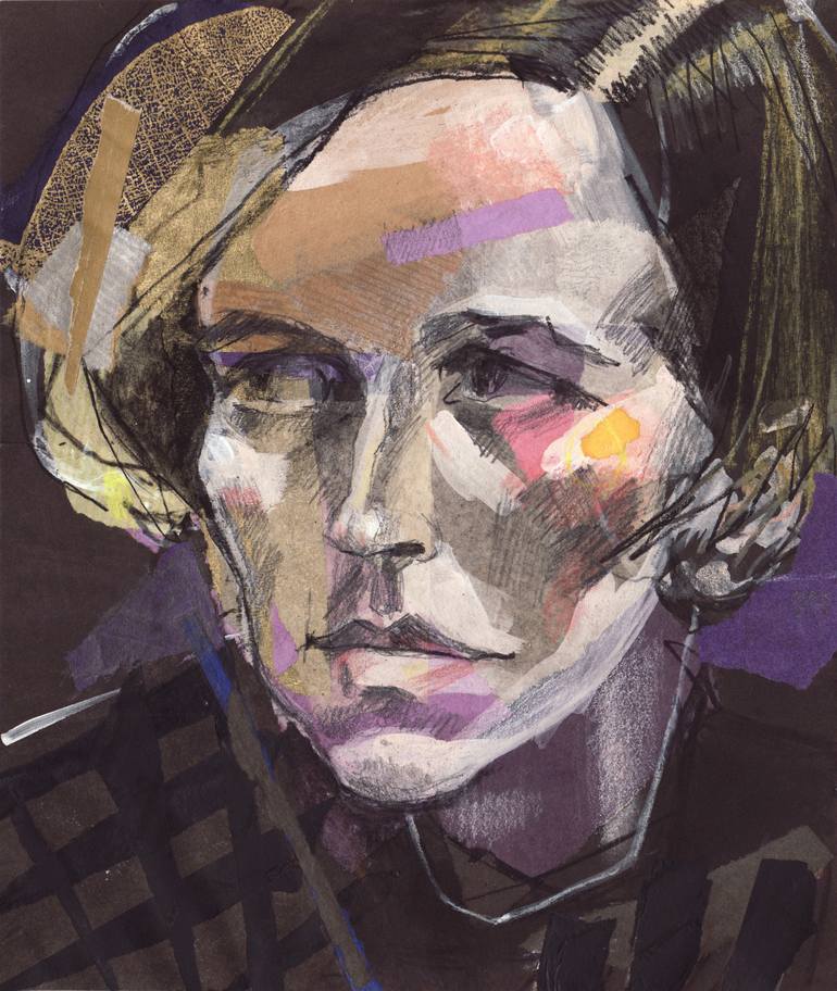 “My works are drawings or collages or a combination of both. All of them are on paper or cardboard. I like working with rough, found materials, they have a liberating effect on me. I have an extensive collection of old coloured paper which I use more or less like paint: I place patches of paper, draw or paint over it, glue more paper of a different colour on top again and so forth. This technique allows unplanned shaping, meticulous modulation, and endless rearrangement all at the same time. Drawing to me is not so much about the result on paper as it is about the process of close observation. While examining somebody or something, the object often becomes strange and somehow new to me. I like that feeling of entering the unknown, and the attentiveness and concentration that comes with it. I have a certain fascination with faces as well as with the dressed figure and the interaction of clothes and body: shapes, transparency, silhouette, colours. I prefer working with life models rather than photographs which again has to do with the experience of close observation, maybe also with that special silent atmosphere when working with somebody real in front of me.”