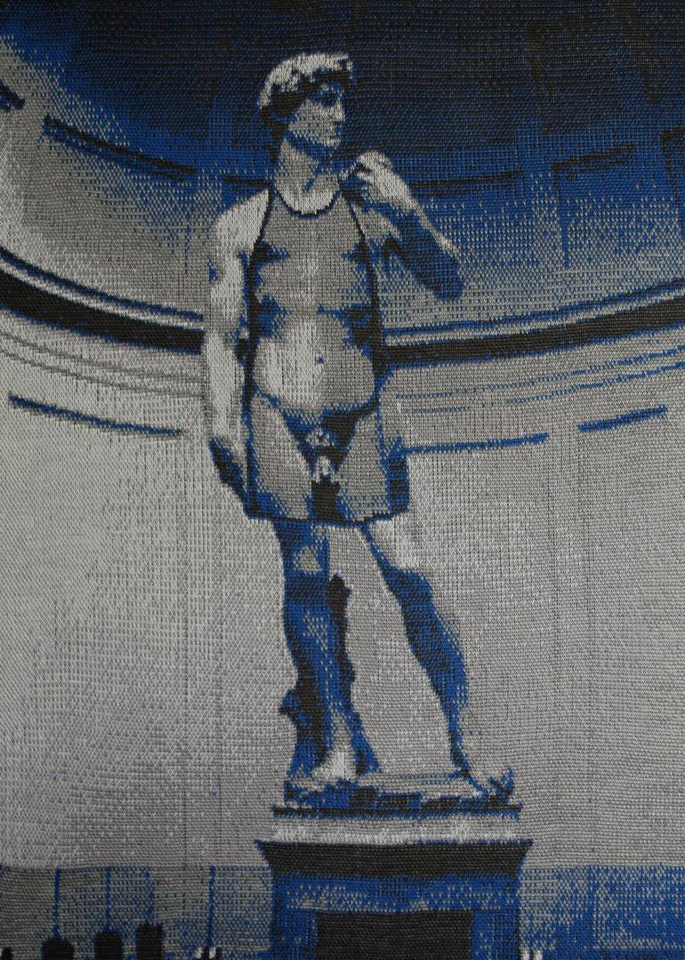 In 'David Wearing an Apron of David' Palmer manipulates a photograph of Michelangelo’s sculpture of David, with him wearing a souvenir apron of himself, of which are found inundating the market stalls around the Accademia Gallery in Florence. Through her knitted tapestries, first exhibited in 2014 ...