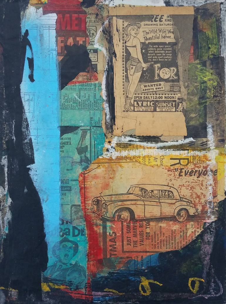 I make layered collage paintings, that create visual histories. My current work is rugged and blends areas of design with those of absolute chaos, wielding newspaper, paint, markers and spray paint. The editing process is about layering–adding and covering back up. My practice dances around with abstraction and figuration. I use exaggerated lines and color, developing art that is bold, physical and has an overall element of fun.
