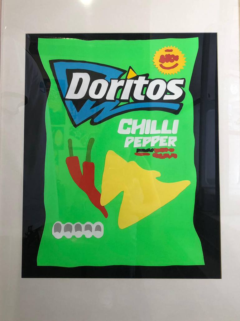 Still life paper collage of a green bag of Doritos Chilli Pepper.