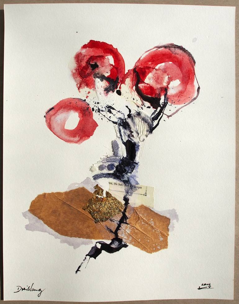 The motif of the simple flower shape (circle) I like very much in my pictures. I glued textile lace, papers, and batting metal on copper printing paper. The circles I painted with a Chinese brush and the lines drawn with a tube. Das Motiv der einfachen Blütenform (Kreis) verwende ich sehr gern in me...