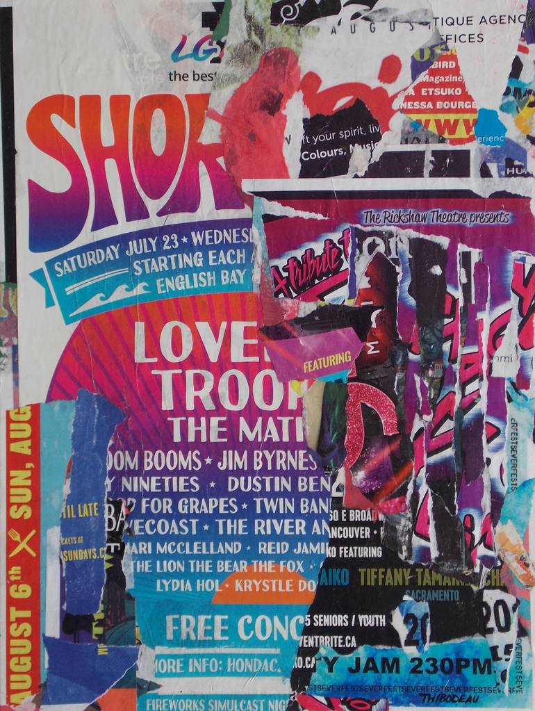 English Bay + Saturday + Free Concert This mixed media, collage, decollage abstract painting of poster papers, papers was adhered, sealed with matte medium, sides are black Reverse has hardware; D Rings, plastic coated stainless steel wire ready to display, hang. Dust with a clean, soft cloth I ...