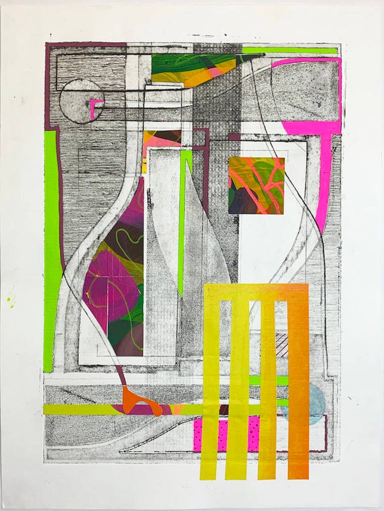 Part of a series of collages inspired by the still life paintings of Ben Nicholson. A collograph of a still life scene is altered to bring life and a playfulness to the surface. A level of curiosity underpins the collage as the artist experiments with line, form, pattern, colours and contrast.