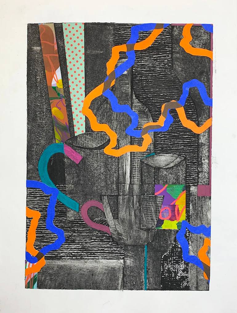 Part of a series of collages inspired by the still life paintings of Ben Nicholson. A collograph of a still life scene is altered to bring life and a playfulness to the surface. A level of curiosity underpins the collage as the artist experiments with line, form, pattern, colours and contrast.