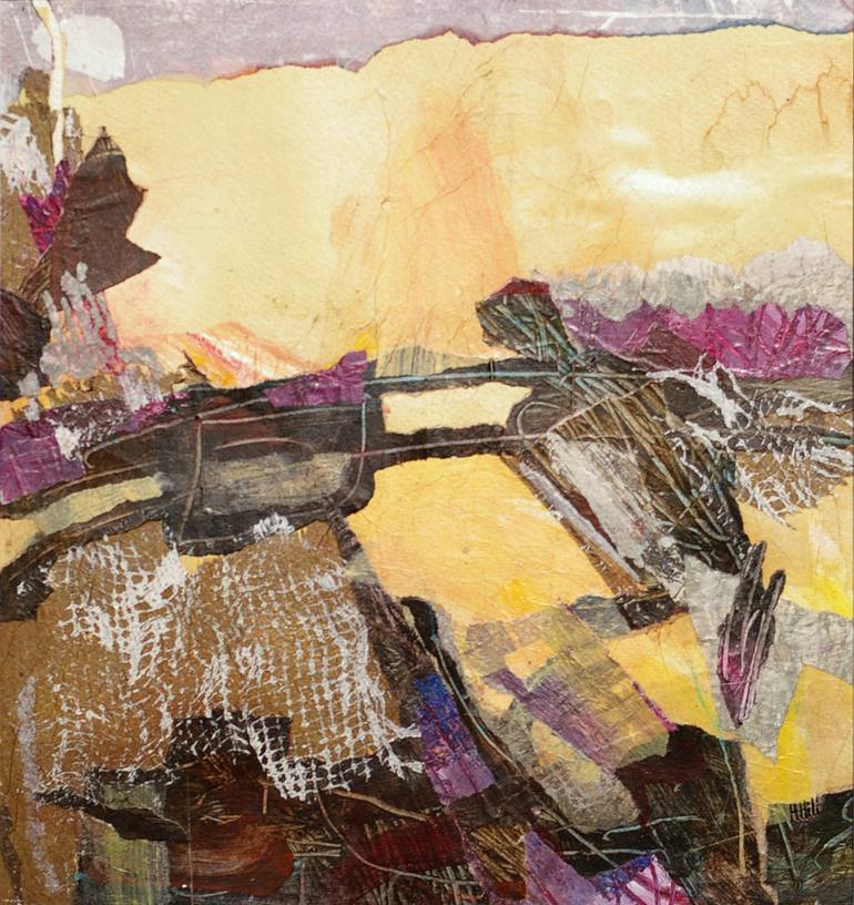 Curiosity is the key, observation leads to discovery. Born in Cornwall UK.Helen Hill later studied Fine art at Central School of Art and Design, London. In 1980,she settled in France where she works and exhibits, now living in the Dordogne in the south west. Her upbringing was near St Ives until the age of 17, much influenced by her ceramist mother, Barbara A.Hill and Cornwall with it's 20th century art and ceramic history. She is inspired by the abandoned mining area along the coast together with the exceptional Cornish light, renowned for many centuries by numerous famous artists. “I’m consciously inspired by landscapes, a view from a window, a stroll through the woodlands or a glimpse through garden vegetation, those of Périgord with its multi-facette forests, of my beloved Cornwall and its now abandoned mines and the undulating pasture land of the Limousin area. Light flickering, sparkling on water, filtering through the woodland undergrowth or menacing skys inspire me to transcribe the emotion felt. The forests of the Dordogne and the calm softness of the Limousin area can be found in my work. My love of nature in all it's forms and the wonder it inspires is my principle driving force and reason for creating. I'm constantly looking for a way of conveying this uplifting sentiment in my work" Collage has always been her principal technique. Paper, all sorts of paper but it must be supple, worked on, reworked on, before starting the composition. Helen Hill creates graphic images on the paper with a theme or subject in mind, however, it’s possible on occasion to be inspired by an area of a prepared piece of paper. Her prints, etchings, monotypes and rubbings are all to be found in the collages all torn up : certain patterns can be be found repeated, reworked but never exactly the same. After the paper preparation, it’s a question of choosing certain areas and tearing them out of the sheets, assembling, composing the collage to create the final work. Collage allows her to build the composition, adding bit by bit, little by little. Mistakes don’t exist, it’s just a question of certain pieces of paper being inappropriate in a given context, so, they become simply partially or totally hidden. The paper preparation step is the creation of a language : words to be chosen and reassembled to create complete text “poems” / ”invitations”.