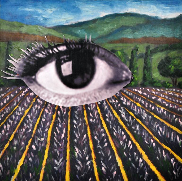 Collage on giclee printed, gallery wrap style canvas with image wrapping around canvas. Signed and titled with a wire hanger in place.