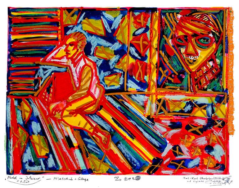 This captivating collage presents a figure in an interior, paired with a portrait, creating a compelling visual narrative. Strong lines define the composition, while vibrant colors and bold contrasts add depth and energy. Crafted with layers of paper, paint, pastel and oil, the artist skillfully co...