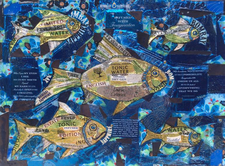 A glass chopping board. This was a featured piece of art called Fin And Tonic which I made by soaking off the labels from bottles of gin and tonic and rearranging into a glistening school of fish. . My local pubs have been amazing in saving all their empties for me and I also go round rummaging in p...