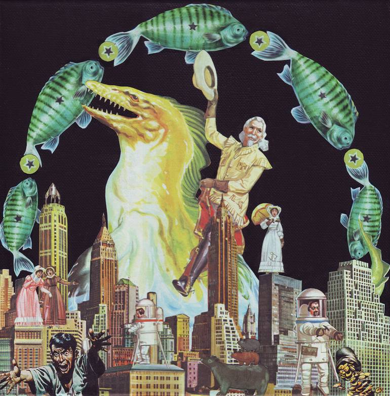 This was the first collage I had made in maybe six months and so there was a lot riding on it in terms of self-confidence. I'm pleased to say I consider it a strong return to form. Paper collage on canvas, coated with Mod Podge and spray sealer.