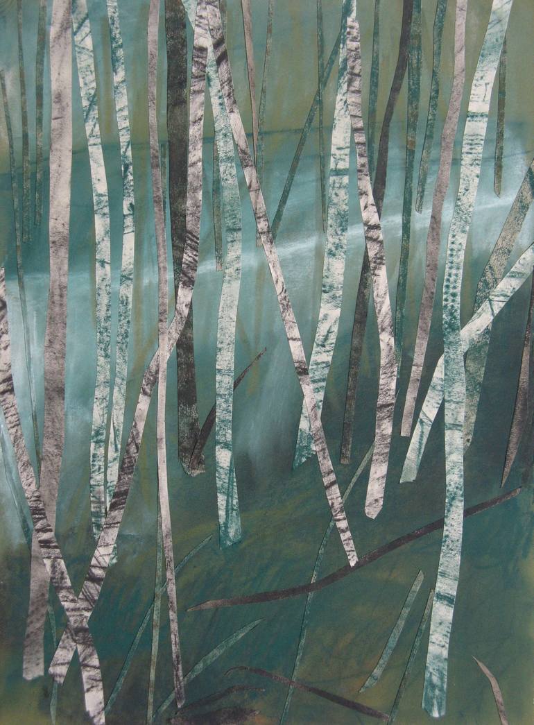 Charcoal and pastel collage. Seeking to evoke the mystery and linear abstraction of the forest