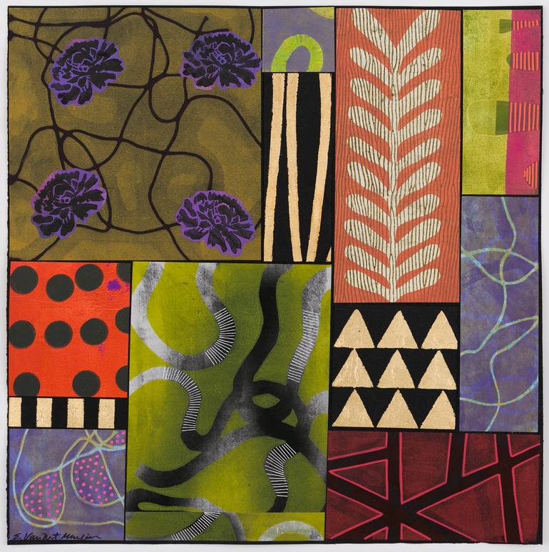 This piece was inspired by the Mexican holiday, El Dia de Los Muertos. While traveling in Oaxaca, Mexico I was inspired by the many rituals and celebrations I saw. The abundance of colors, patterns, nature and celebrations inspired the various monotypes and carved stamps I used to create this series...
