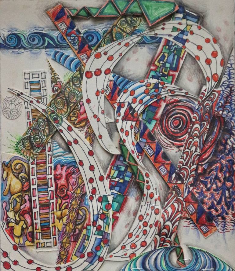 Whimsical, playful mindfulness. A dimensional, abstract collage taking the viewer along for a joyful feel good experience..Influencers are Miro, Klee