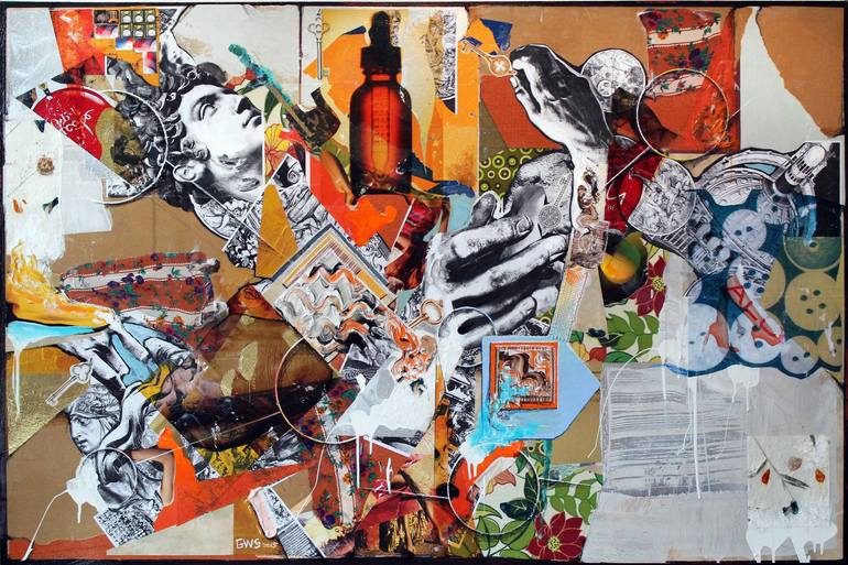 I make thoughtful mixed-media works that mediate friction between narrative and materiality. Novelistic pastiche and intuitive abstract painting confront each other in a bricolage of photographs, paint, and found objects. From a trace discovered in a few abject elements at the beginning of my process, I interweave strata, adding and subtracting components strategically or intuitively to create a quirky grammar of intellect and wonder. While my development has been steadily nourished by great mixed-media artists of the past, including Kurt Schwitters, Robert Rauschenberg and the Kienholzes, I'm also inspired by contemporaries like Fred Tomaselli, Julian Schnabel and Barnaby Furnas. Due to a lifelong visual impairment, I have access to the Library of Congress audio collection; the books I listen to while painting frequently inform my work. I think of my pieces as contemporary equivalents to religious icons, memory gardens or totem poles; abstracted story-boards in which the gaze explores systems of interpretation and meaning in a shared situation with the artwork. My practice seizes the narrative debris of Spectacle - advertisements with their flattened affect, litter, hyper-real media images, plastic paint - and humanizes them in matrices of personal symbolism. I strive to push the narrative element as far as it can go in materiality and, beyond merely illustrating, signify stories infused with broad, universal themes and questions.