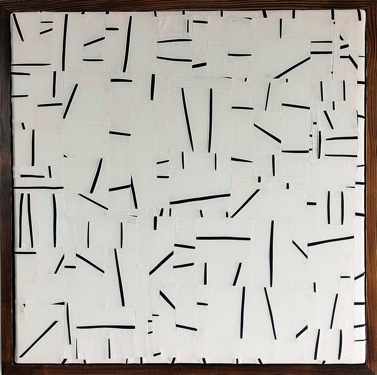 This textile artwork exemplifies innovative approach to fabric as a fine art medium. Crafted through fabric collage techniques, the piece features a dynamic interplay of fragmented black lines on a white backdrop, creating a sense of movement and rhythm. The seemingly random placement of linear elem...